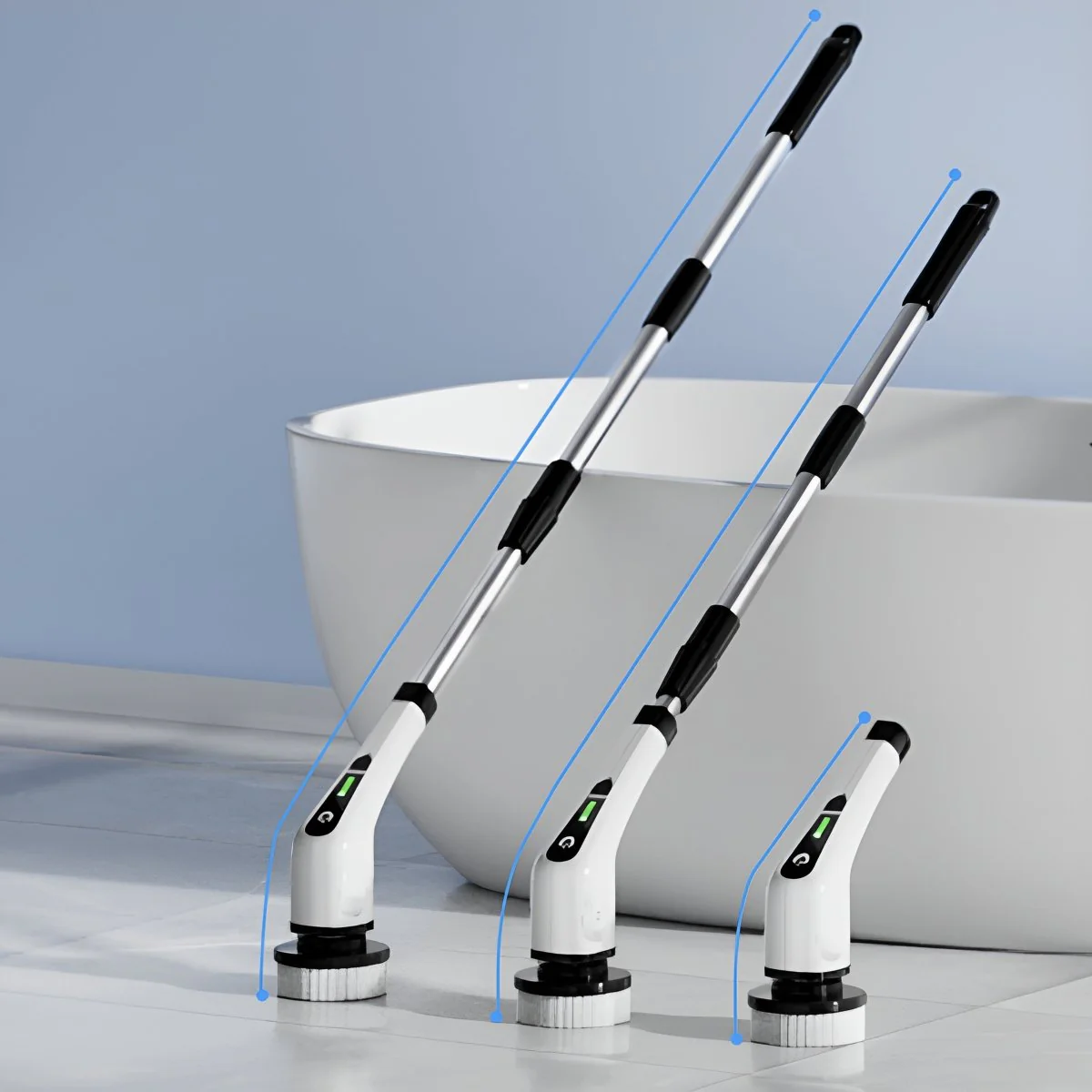 Förenkla stÀdningen med vÄr automatiska skrubbare - ett kraftfullt verktyg med förlÀngningsbart skaft och Ätta anpassningsbara borsthuvuden för att göra rengöringen enkel och effektiv. Skapa ett skinande rent hem utan anstrÀngning.